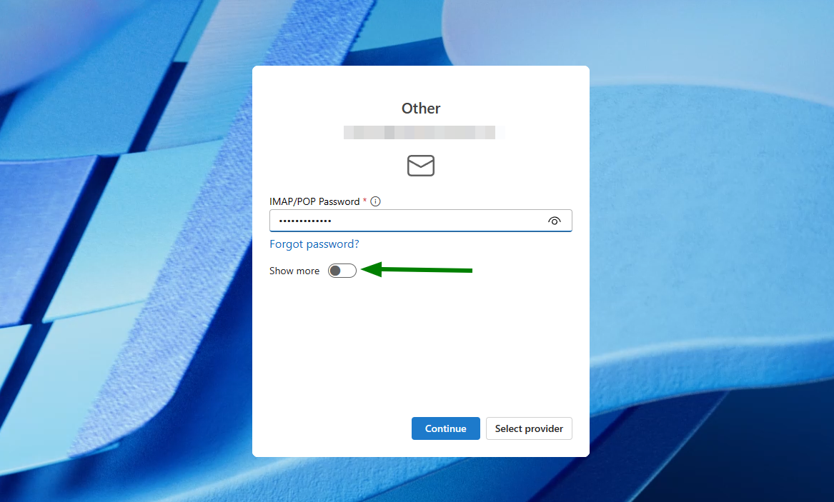 Then, in the next window, click Show more to reveal the incoming/outgoing server settings.