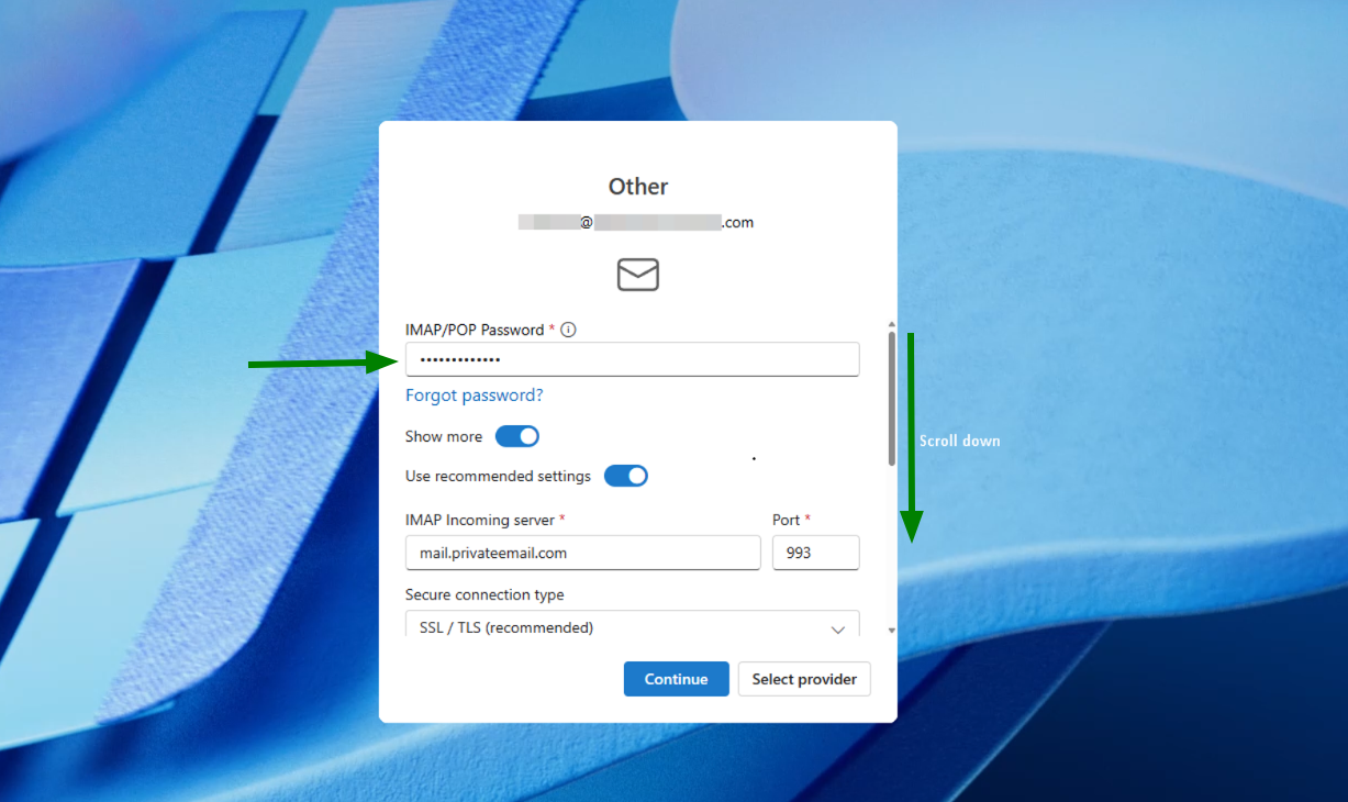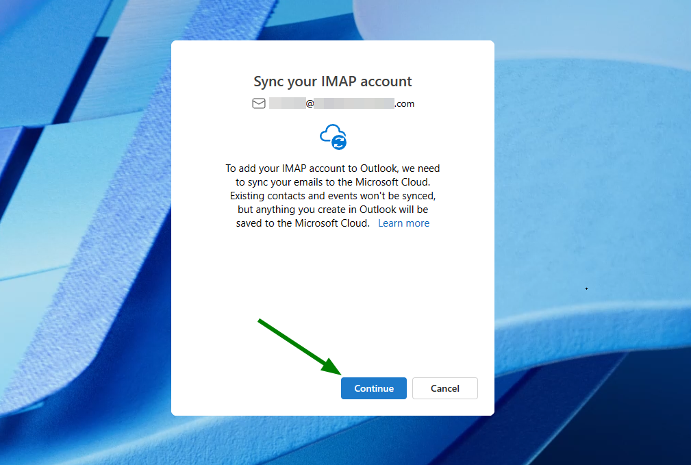 Next, after launching Outlook, enter the Private Email address you’d like to add and press Continue.