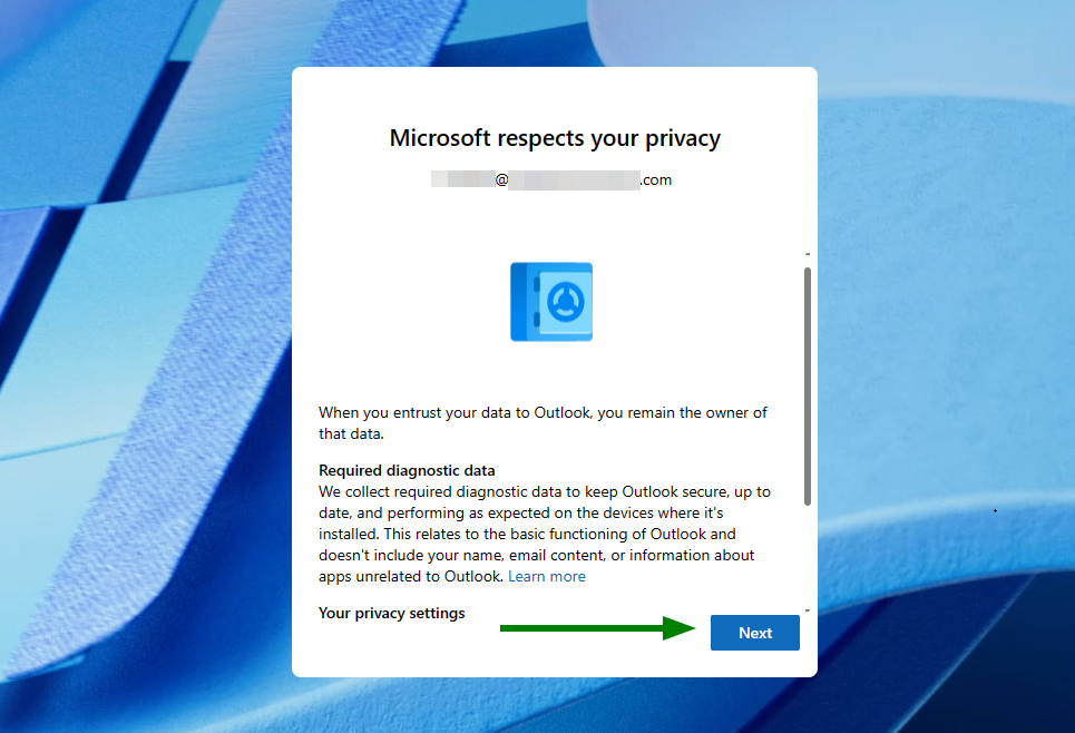 After that, Outlook will navigate to a new privacy-related window. To proceed, press Next.