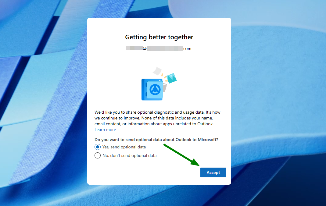 8. Finally, to complete the setup, Outlook will ask if it can collect user data for service improvement. Simply select your preference and click Accept.