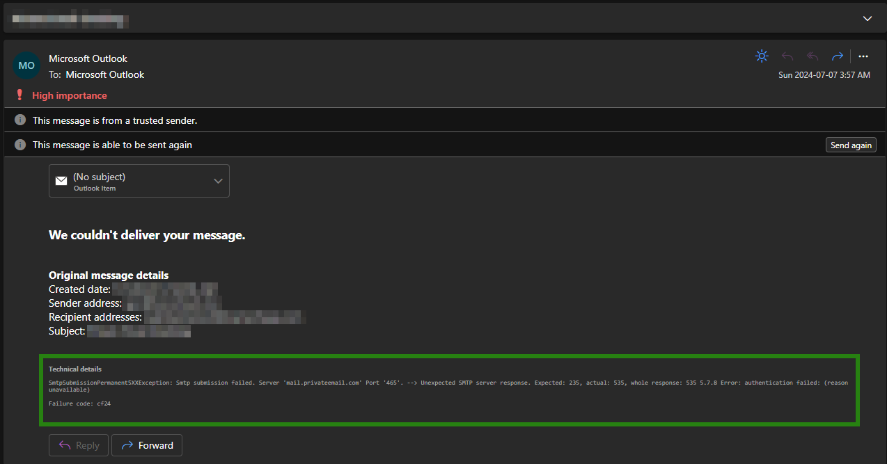 Also, you may face the following error during sending emails: “SmtpSubmissionPermanent5XXException: Smtp submission failed. Server ‘mail.privateemail.com’ Port ‘465’. –> Unexpected SMTP server response. Expected: 235, actual: 535, whole response: 535 5.7.8 Error: authentication failed: (reason unavailable)”. In this case, please make sure the password in SMTP settings matches the correct password for the Private Email mailbox.