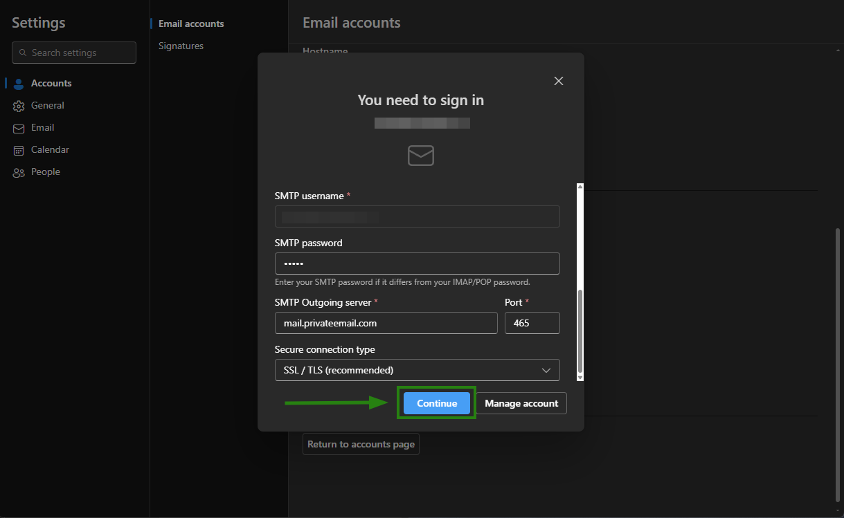 5. On the next page, you will see incoming and outgoing server settings.Make sure all of them are set properly. If any information is set incorrectly, update it for both Incoming mail and Outgoing mail configurations.6. Once all details for the outgoing connection are updated, click Continue: