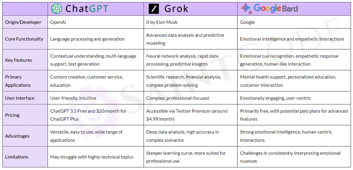 ChatGPT, Grok, and Bard are not just ordinary chatbots; they represent the pinnacle of advancements in conversational AI. ChatGPT, developed by OpenAI, is renowned for its language understanding and generation capabilities, making it a versatile tool for a wide range of applications. Grok AI, on the other hand, is known for its advanced data processing and problem-solving abilities, often linked to Elon Musk’s vision of AI. Bard, while a newer entrant, brings a unique approach to conversational AI with its focus on emotional intelligence and context-aware responses.